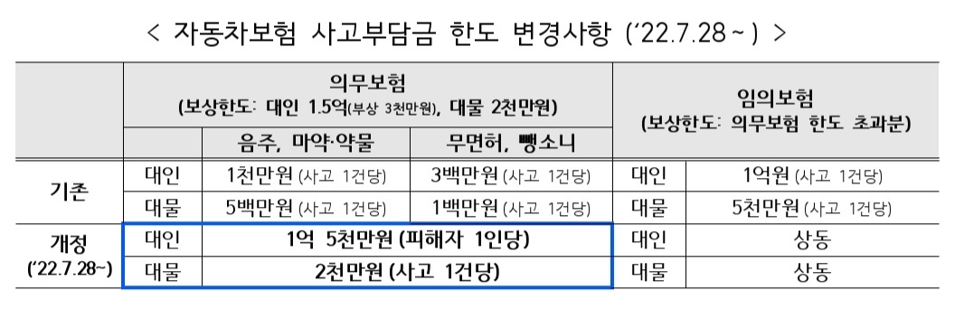 7월 28일 이후 보험 가입자- 대인 4억원(의무보험 3억원, 임의보험 1억원, 대물 2천만원(의무)